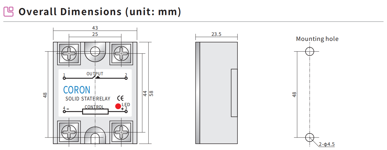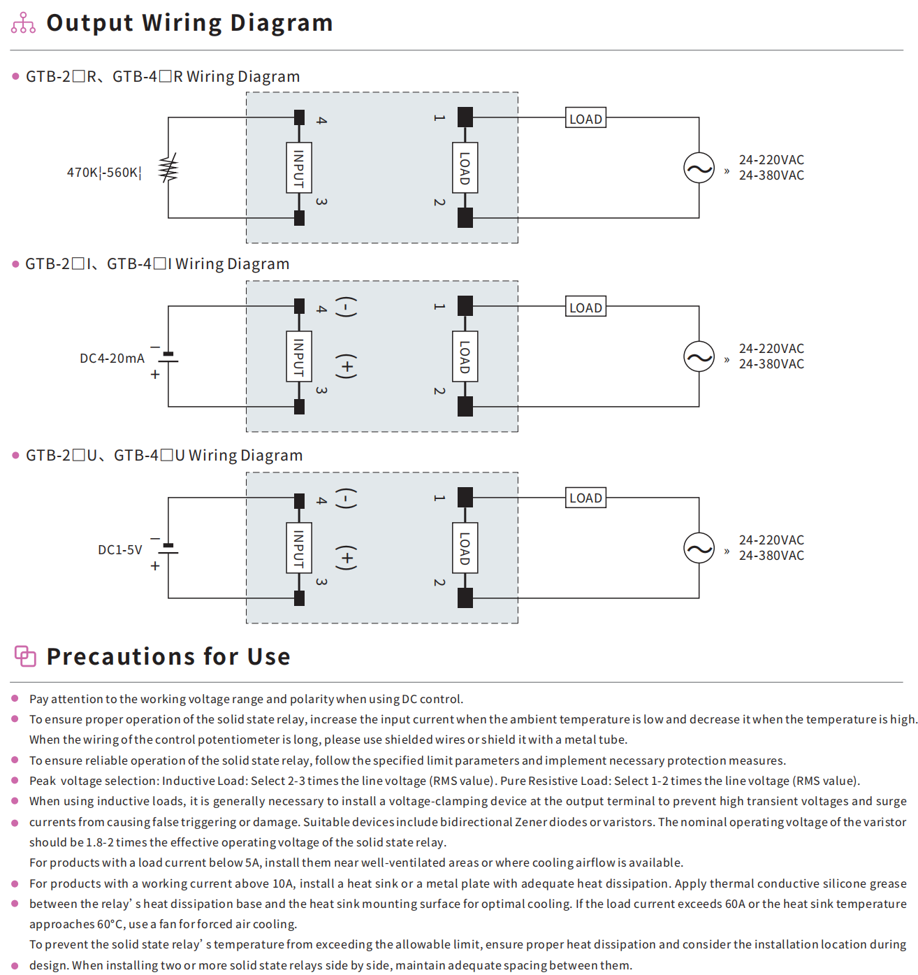 Novel structure with sunken terminals to protect the exposed wiring. Widely used in 10-120A output current solid state regulator. External potentiometer or 4-20mA, 1-5VDC weak current voltage, to achieve the control of strong electricity. It has high working current, surge impact resistance and high reliability. Optical isolation between input and output circuits. Withstand voltage 2500V. LED indicator can indicate its working status. Built-in resistive-capacitive absorption circuit for more absorption effect. Miniaturised and universal size common, can be uniformly installed. Equipped with a safety cover.