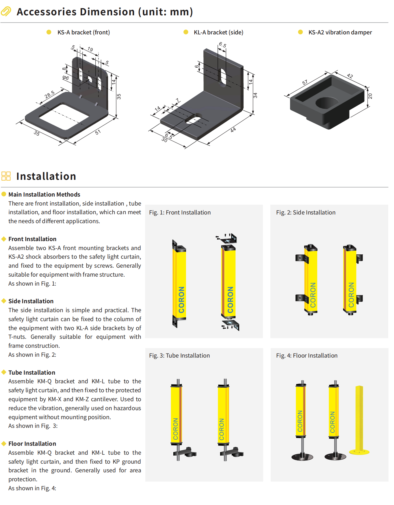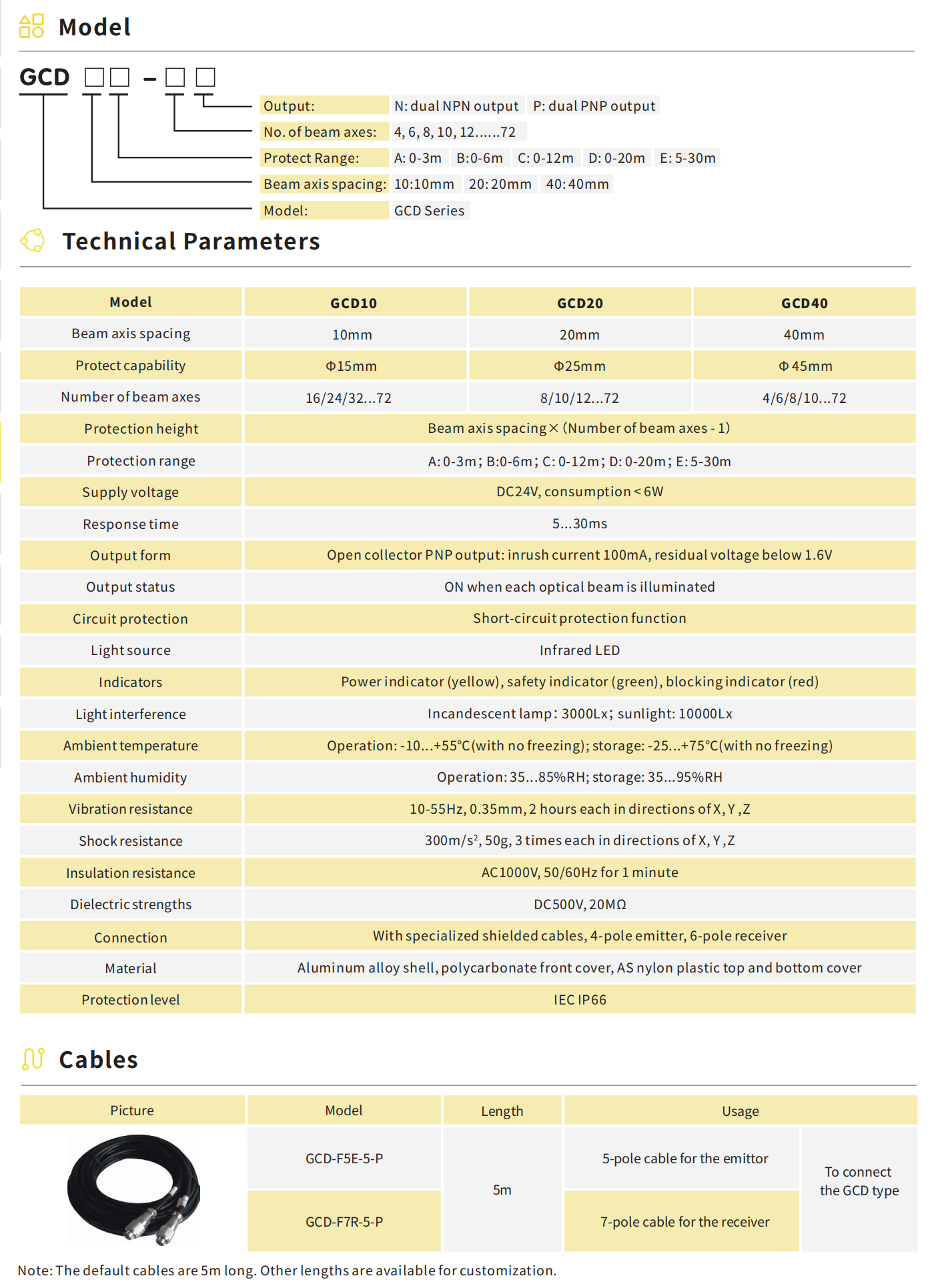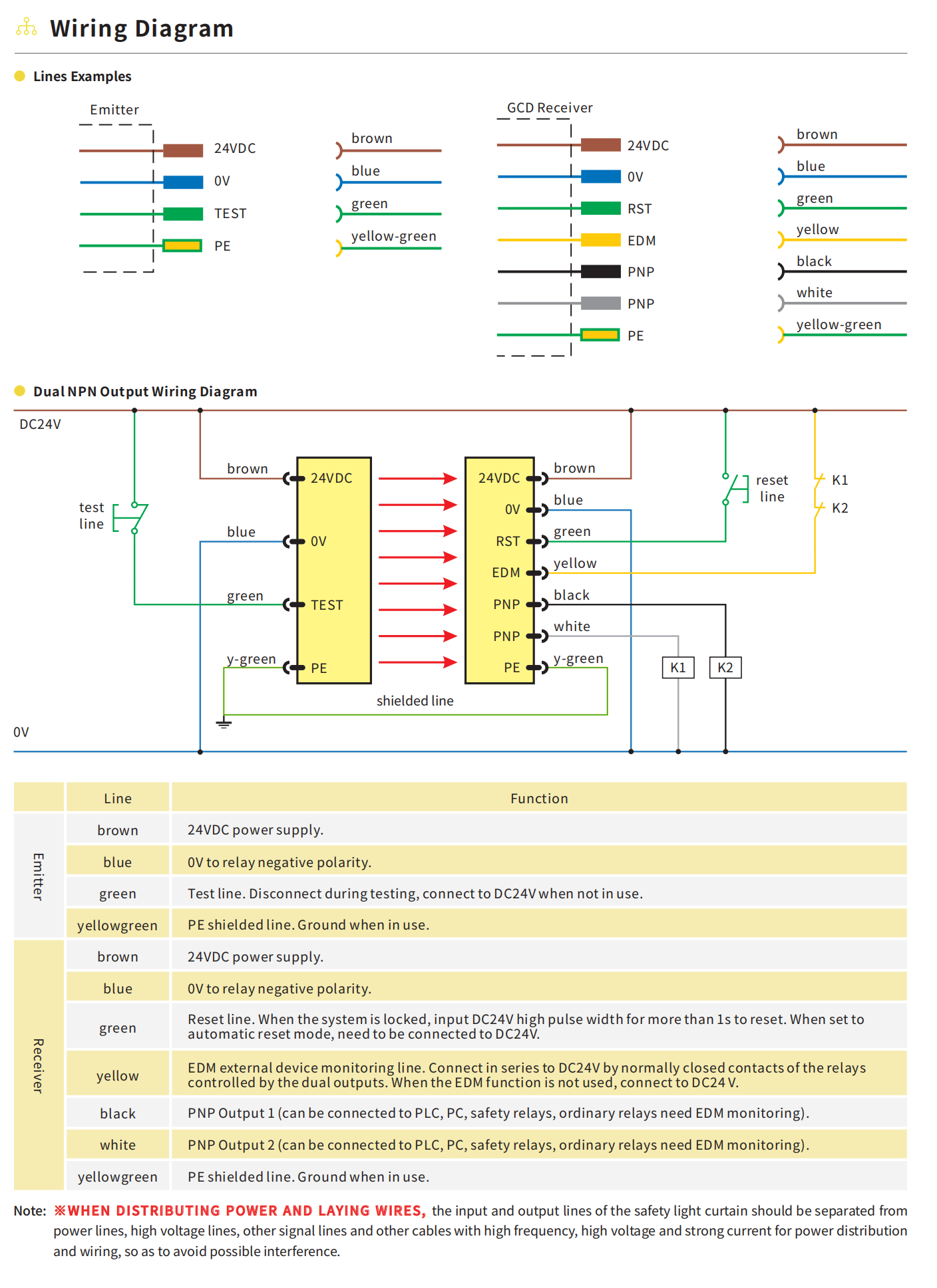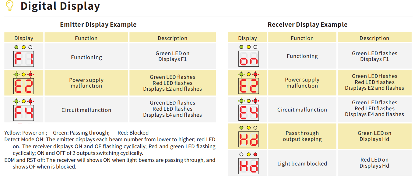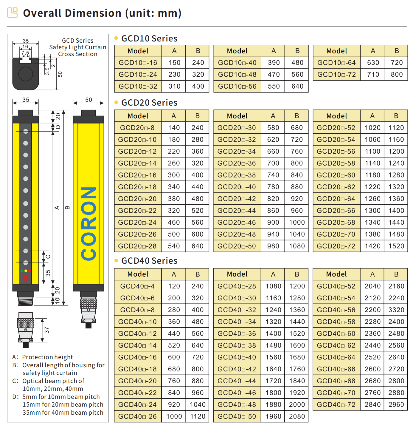 Safety class IV, compliance with IEC61496-1/2 safety standard. Equipped with digital tube display, which can show the number of light paths being blocked. Real-time CPU self-test, when the safety light curtain itself fails, it will not send out an error signal to the controlled equipment to ensure the safety of the safety light curtain. External device monitoring function prevents the function error due to external relay bonding failure. High resolution design, with the minimum beam pitch of only 10mm. Solid metal shell with a size of only 35mm x 50mm, can be installed on large and heavy machinery. High-quality protective structure design and vibration resistance design, so that the light curtain can be used reliably in harsh use occasions and heavy equipment. Optical synchronization technology, no wire connection is needed between the emitter and receiver. Professional optical lens frame and advanced optical system design, excellent light gathering characteris tics and strong anti-external light interference ability. - Good electromagnetic compatibility and strong anti-interference ability. Can be used reliably in high frequency and high magnetic environment such as inverter and servo motor. PNP dual independent output, can be conn